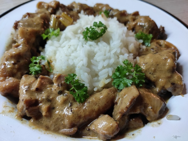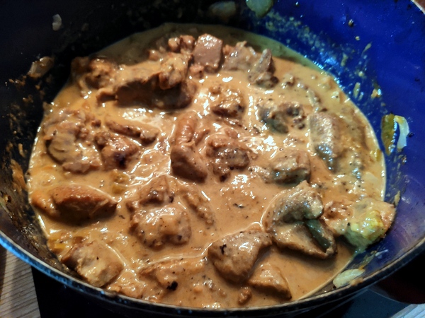 Na asi čtyři porce jsem vzala 3/4 kg krůtího horního stehna, to už počítám bez kosti, předpokládala jsem, že se dosti smrskne (a taky že jo). Nakrájela jsem jakés takés kostky i s kůží, ta se vypeče. Spíše mírně jsem osolila, okmínovala, opaprikovala. opepřila. Maso jsem dala osmahnout na 2 lžíce sádla a mezitím jsem si nakrájela 100 g slaniny, 3 cibule a pár stroužků česneku. Navíc jsem přikrájela jeden celerový řapík, nemusí být. Když bylo maso dost hnědé, orestovala jsem s ním i všechnu zeleninu a slaninu, pak přiklopila pokličkou a nechala dusit. Ani podlívat nebylo třeba, tekutinu pustí i ta zelenina. Zhruba po hodince bylo vše měkké. Stačilo dochutit asi 3-4 lžícemi fernetu – musí se chvíli provařit, aby se chutě propojily, a přidat trochu smetany ke šlehání (cca 100 ml), tedy půl kelímku. Hustá, dobře ochucená omáčka s krůtou ladila. V originále se dává ještě majoránka, na tu jsem nějak zapomněla, a jako příloha jsou prý nejlepší bramborové knedlíky nebo těstoviny, nám ferneťačka chutnala i s rýží. Chuť je tak nějak česká, vlastně retro. Výborná omáčka a skoro z ničeho… Už jsem ji vařila znovu, dala jsem fernet k masu hned po opečení a je to taky dobré. Alkohol pomůže masu trochu změknout, rozpustí lépe kližky a šlašky. (2020)
