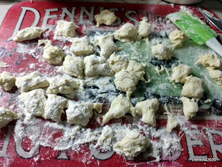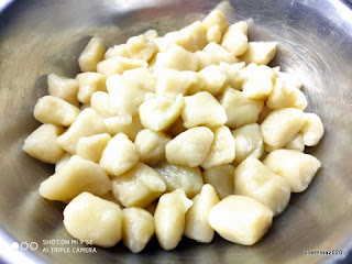 Další trik se týká přípravy válečků: na vále posypaném moukou z těsta jsem utvořila na prst vysokou placku, víceméně obdélníkovou. Tu jsem rozkrájela na přiměřené pruhy a z nich válela tenčí prameny. Opravdu to šlo snadno. Pak následuje nakrájení válečků na jednotlivé noky. U toho se musí dávat pozor, aby se neslepily, postupně je oddělovat a prosypávat moukou. Pěkné video najdete tady.